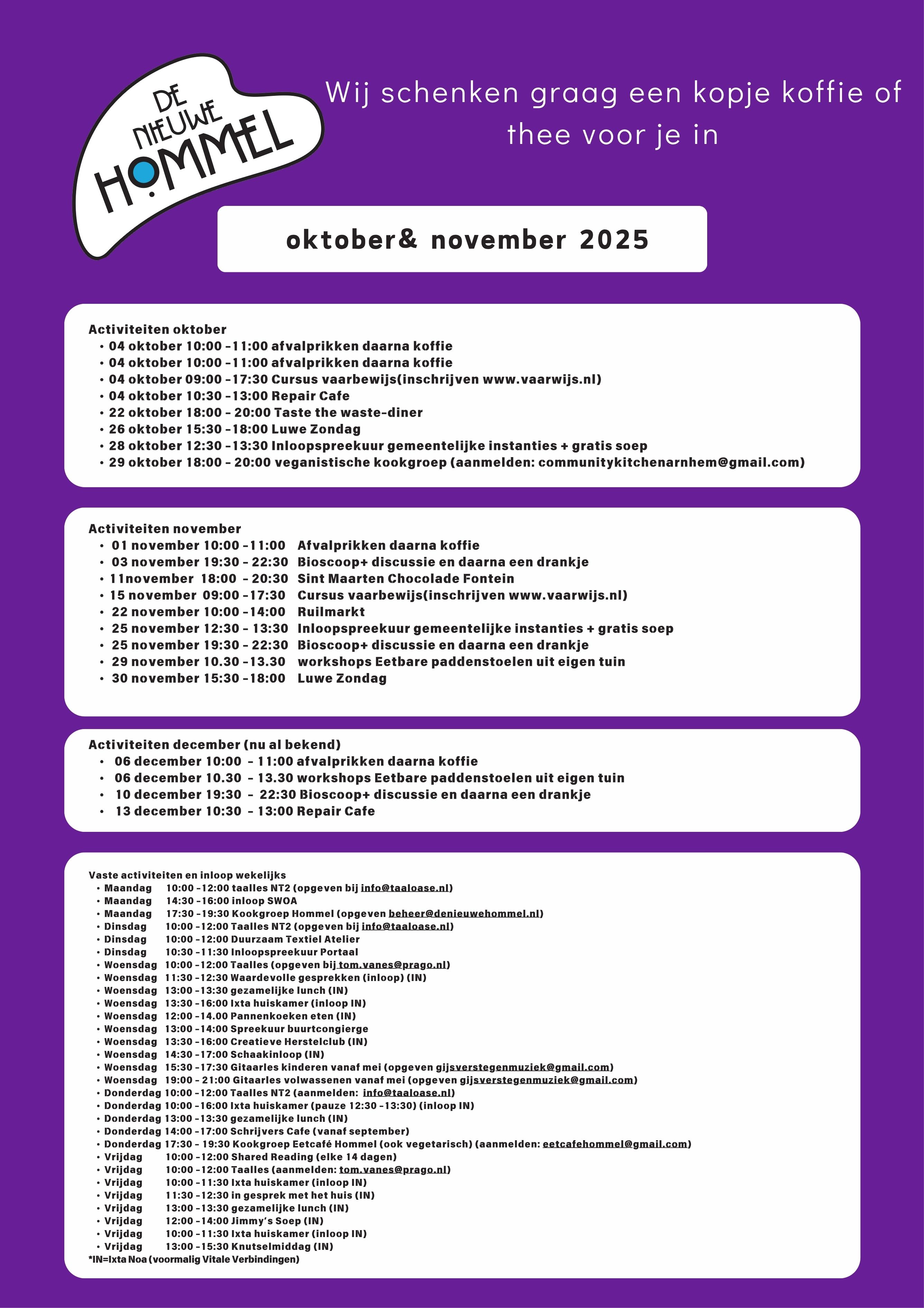 Ben jij een buurtbewoner en wil je op andere momenten aan de slag in De Nieuwe Hommel of hier een te gekke buurt activiteit organiseren? Dat kan, als het gaat om een activiteit voor en door de wijk en als er vrijwillig beheer geregeld kan worden. Neem contact op met beheer@denieuwehommel.nl
